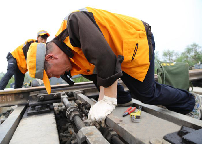 圖為該段職工正在秋檢中調整道岔壓力。