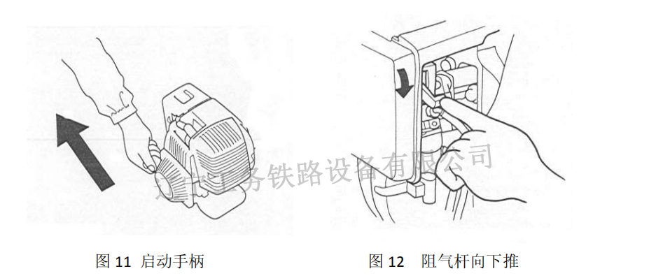 在輕輕拉啟動(dòng)手柄,直到感到有阻力時(shí)再用力拉,如汽油機(jī)長(zhǎng)時(shí)間未使用,應(yīng)連續(xù)拉動(dòng)啟動(dòng)手柄幾次使汽油進(jìn)入油路系統(tǒng),汽油機(jī)即可發(fā)動(dòng)(見圖 11);