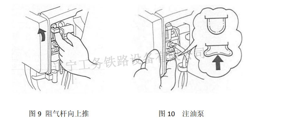 首先將汽油機(jī)的啟動(dòng)開關(guān)撥至“ON”位置(處于汽油機(jī)右側(cè));然后把阻氣桿移至關(guān)閉位置(見圖 9),氣門處于關(guān)閉位置,按注油泵數(shù)次直到汽油回管中可以明顯地看到油流時(shí)為止(見圖 10)